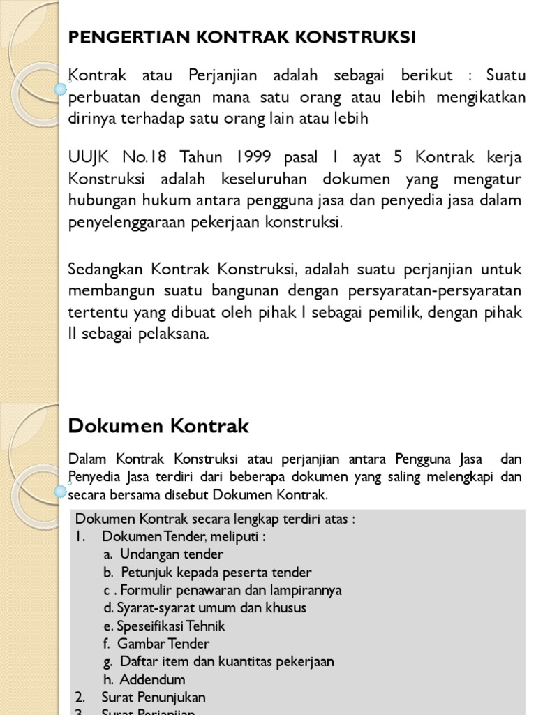 Pekerjaan Konstruksi Rapat Teknis Pengendalian Apbd Kota Surabaya from slidetodoc.com 2 tahun 2017 kontrak kerja konstruksi pasal 46 (1) pengaturan hubungan kerja antara pengguna jasa dan penyedia jasa harus dituangkan dalam kontrak kerja konstruksi. Secara umum, fungsi dari kontrak konstruksi adalah sebagai berikut. Keseluruhan dokumen yang mengatur hubungan hukum antara pengguna jasa dan penyedia jasa dalam. Jenis pekerjaan pada kelompok ini yaitu supervisi/pengawasan pekerjaan konstruksi, monitoring, manajemen konstruksi, survey, dan lainnya. Hal 90.menurut pasal 1 ayat (5) uujk, kontrak kerja kostruksi merupakan: Penjelasan kontrak kerja konstruksi dalam uu jasa konstruksi no. Pada hari ini tanggal bulan april tahun dua ribu tujuh belas ( april 2017), yang bertanda tangan di bawah ini : Neither law nor doctrine can provide a clear understanding of good faith in contract law.